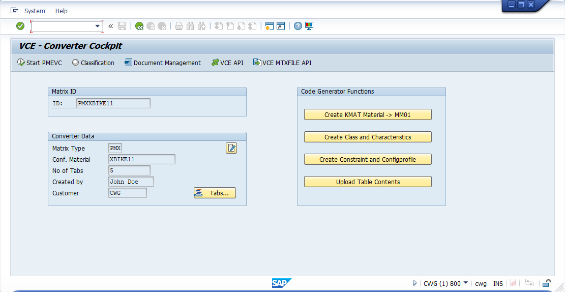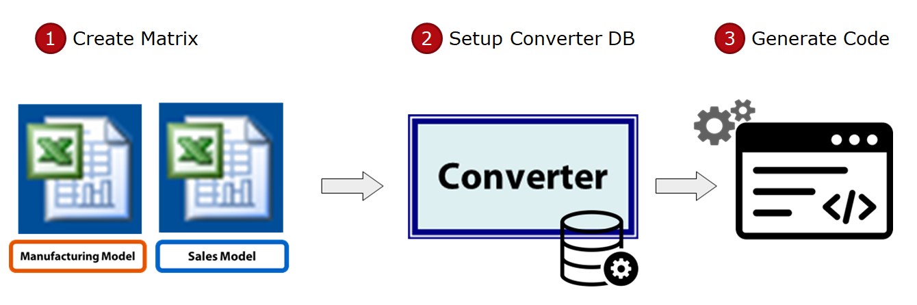When the Matrix is defined and ready, all data that is needed to create the configurator in SAP can be derived. The Matrix will be uploaded to the (cloud) converter and the AI will generate the coding. The generated coding can be uploaded with transactions in SAP.